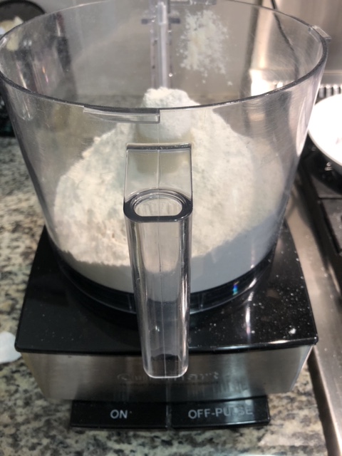 Add flour and salt to food processor. Pulse a few times to mix.Cut-up frozen butter into 1/4″ pieces along the length of the cube and once crosswise. Add frozen butter to food processor and pulse 4 or 5 time to incorporate. Cut-up frozen shortening into !/2″ pieces. Add cut-up frozen shortening and pulse until butter and shortening are in pea size pieces. The butter and shortening will look like this.Butter and shortening in pea size pieces.Add ice cold water and pulse 3 or 4 times until the dough starts to clump. Do not add too much water. A ball will not form in the bowl. If the dough does not start to clump together add 1 tblsp. at a time of ice cold water and pulse a couple times until the dough start to clump together.Remove dough from food processor and place on a piece of plastic wrap. Note the two finger indentations. The dough should stay together in a ball when compressed with your hands.Place dough in between two pieces of plastic wrap. Use two pieces of plastic wrap on each side of the dough if necessary for the diameter of the pie plate. Keep the plastic wrap as flat as possible (no wrinkles). Roll the dough out evenly to about 1/8″ thickness. You should be able to see the shadow of your hand when you place it behind the dough. Remove one side of the plastic wrap, then loosely place the plastic wrap back onto rolled out pie dough. Flip over and carefully remove the second side of the plastic wrap. Place dough on top of buttered pie plate. Use the plastic wrap to form a fluted edge on pie plate. Uncooked pie dough with apple filling.Finished baked Dutch Apple Pie