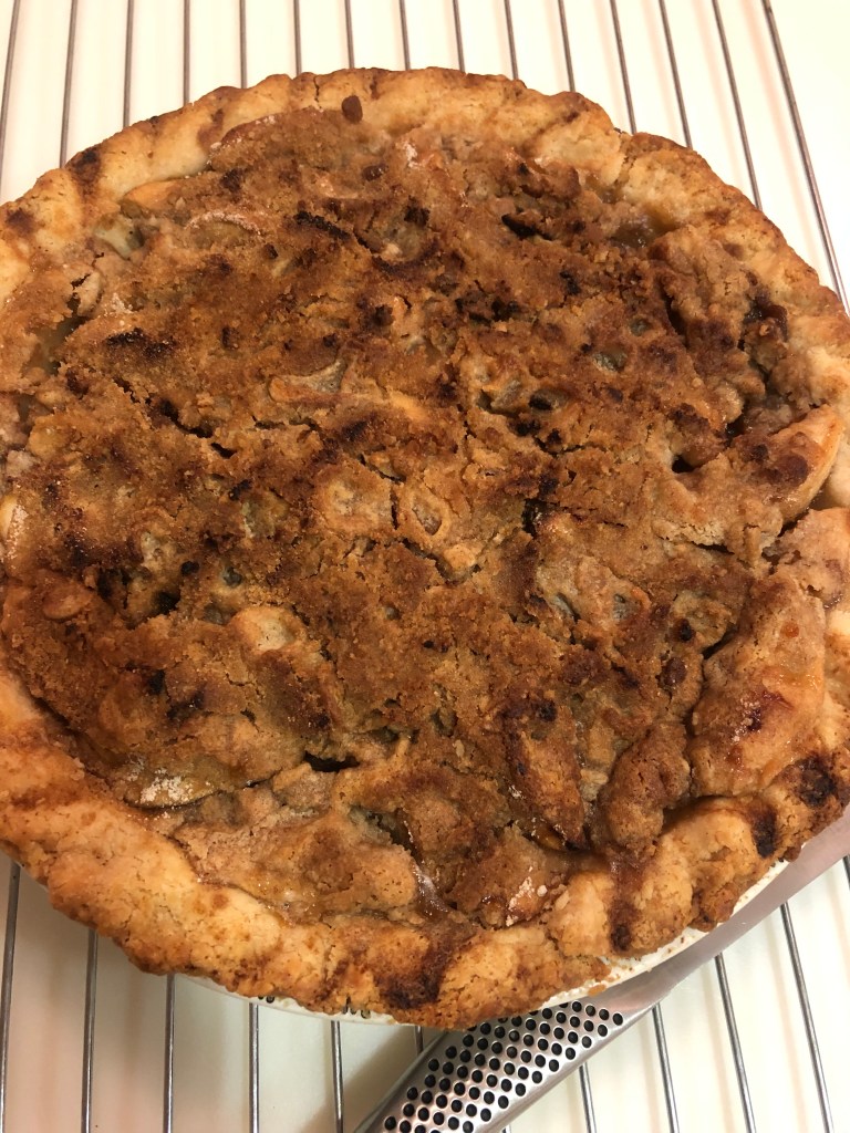Bake pie for 10 minutes at 425 degrees then turn down the temperature to 350 degrees for 45 minutes or until the apples are soft and the topping is golden brown.